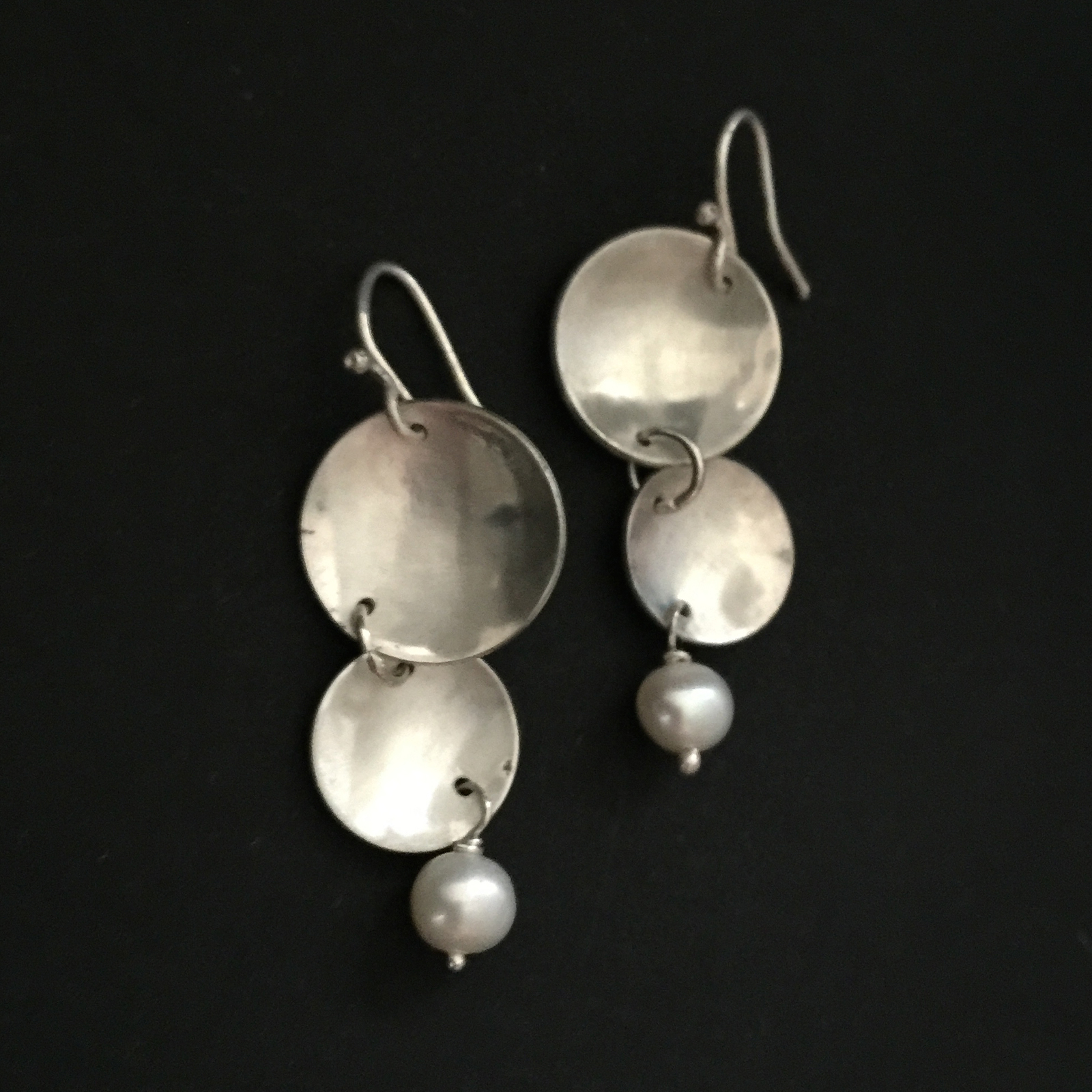 Formed sterling silver disks and pearl drop earrings.