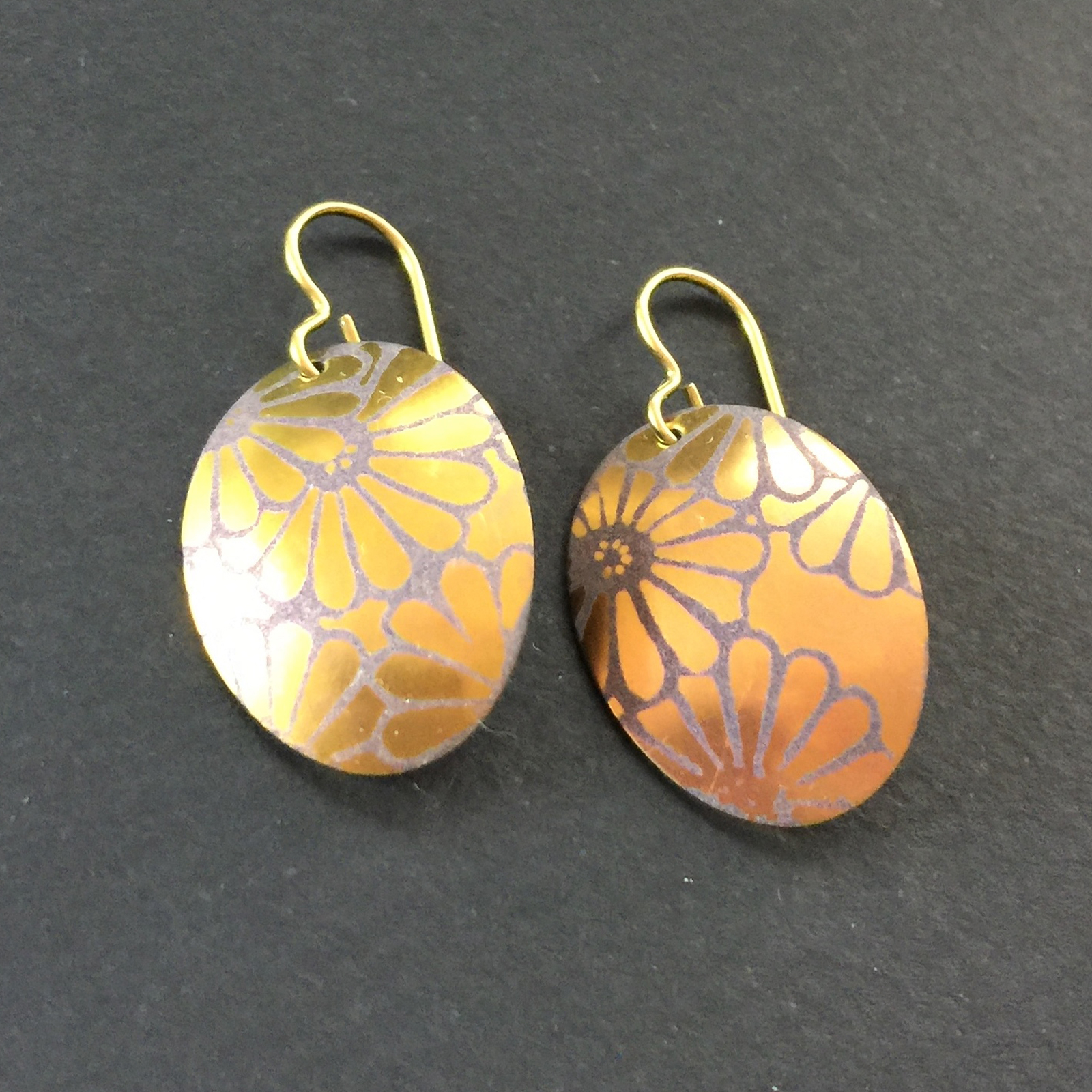 Etched oval chrysanthemum pattern earrings.